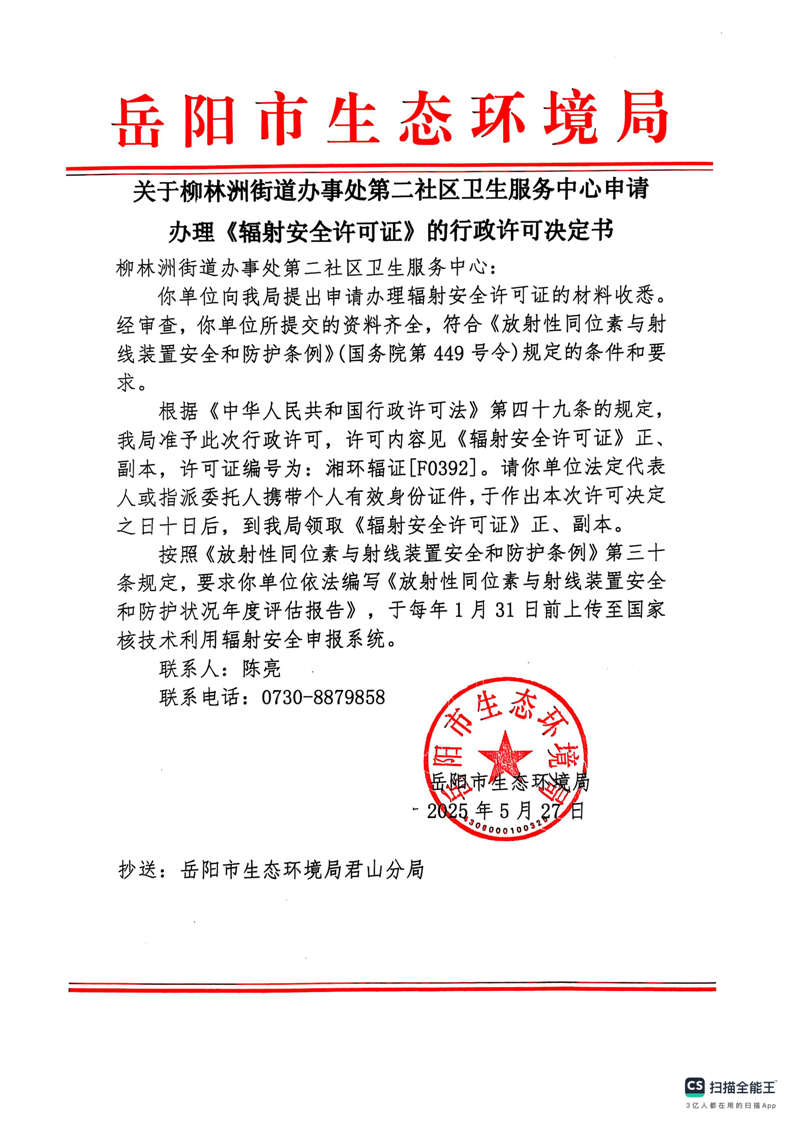 关于柳林洲街道办事处第二社区卫生服务中心申请办理《辐射安全许可证》的行政许可决定