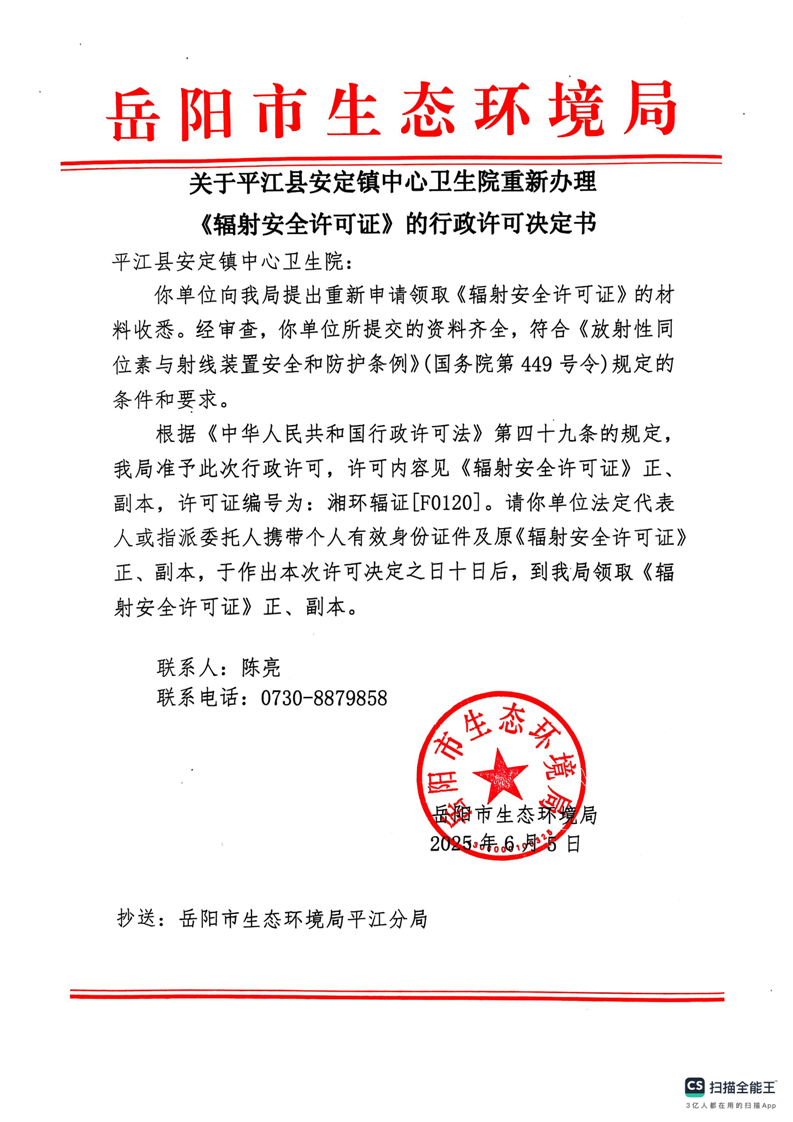 关于平江县安定镇中心卫生院重新办理《辐射安全许可证》的行政许可决定