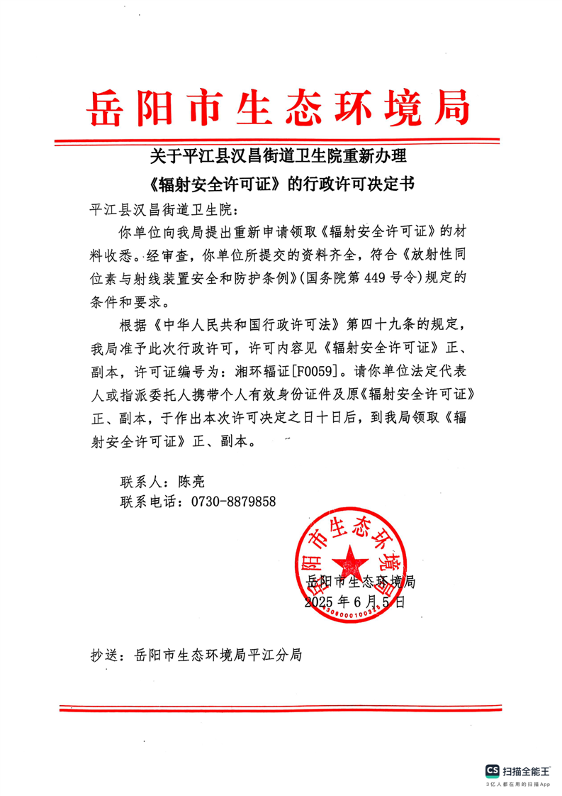 关于平江县汉昌街道卫生院重新办理《辐射安全许可证》的行政许可决定
