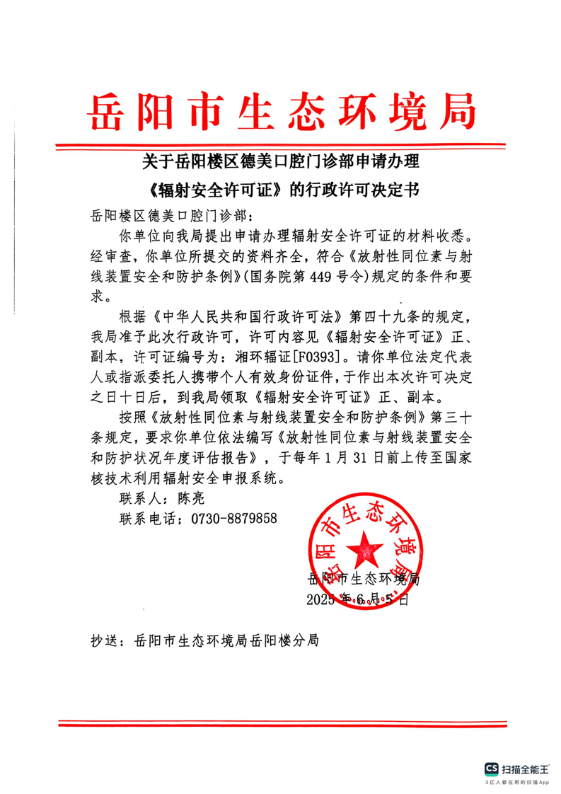 关于岳阳楼区德美口腔门诊部申请办理《辐射安全许可证》的行政许可决定