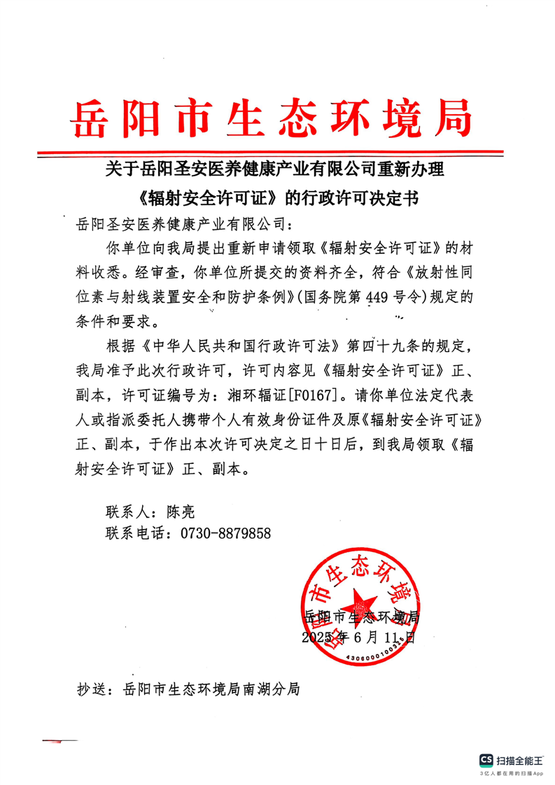 关于岳阳圣安医养健康产业有限公司重新申领《辐射安全许可证》的行政许可决定