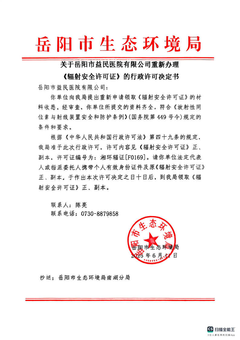 关于岳阳市益民医院有限公司重新申领《辐射安全许可证》的行政许可决定