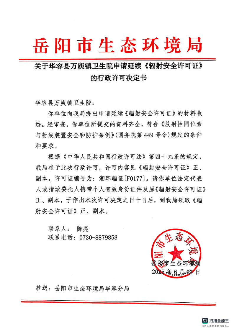 关于华容县万庾镇卫生院申请延续《辐射安全许可证》的行政许可决定