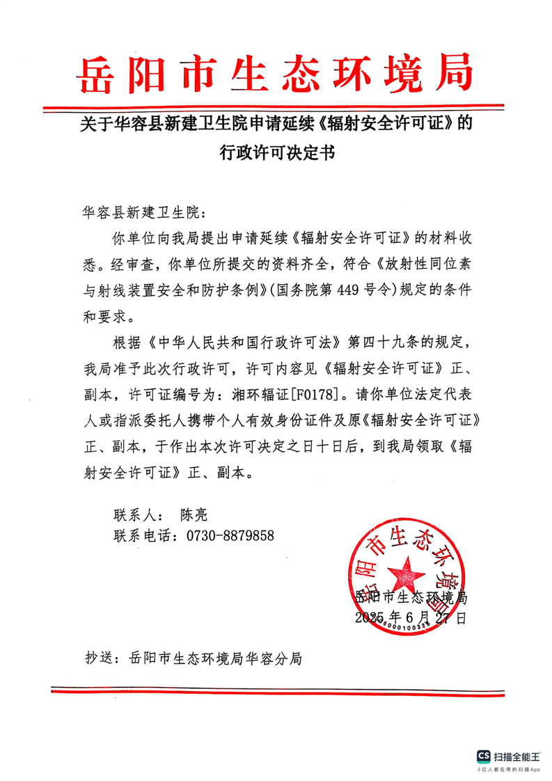关于华容县新建卫生院申请延续《辐射安全许可证》的行政许可决定