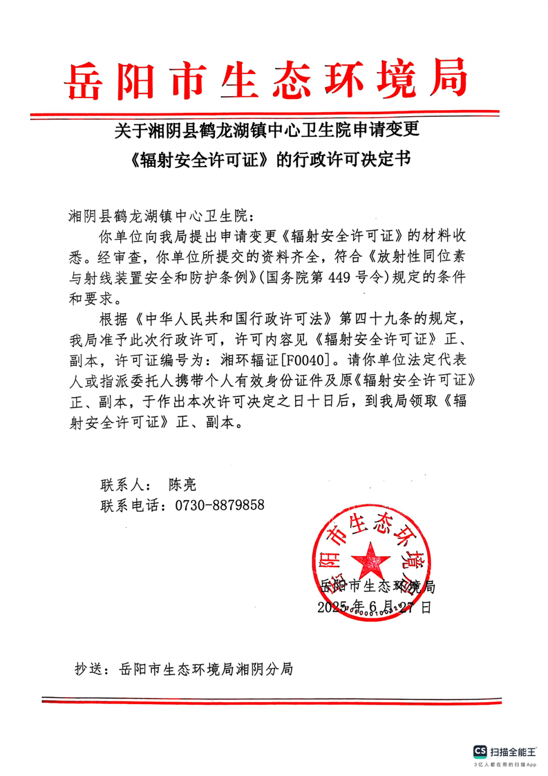 关于湘阴县鹤龙湖镇中心卫生院申请变更《辐射安全许可证》的行政许可决定