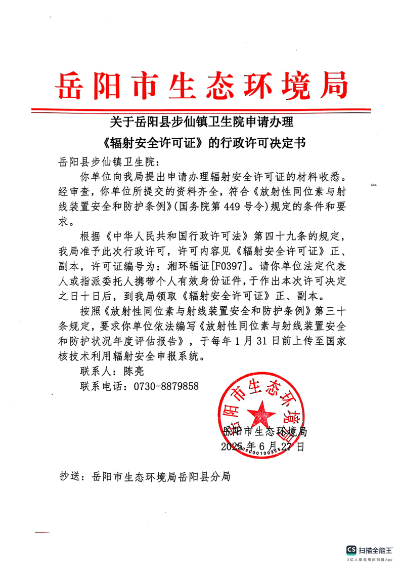 关于岳阳县步仙镇卫生院申请办理《辐射安全许可证》的行政决定