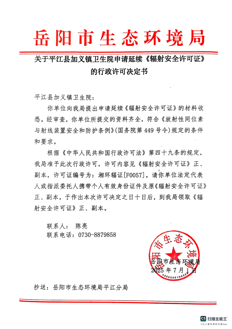 关于平江县加义镇卫生院申请延续《辐射安全许可证》的行政许可决定