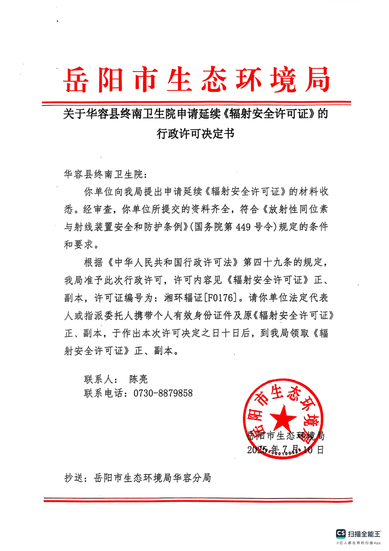 关于华容县终南卫生院申请延续《辐射安全许可证》的行政许可决定