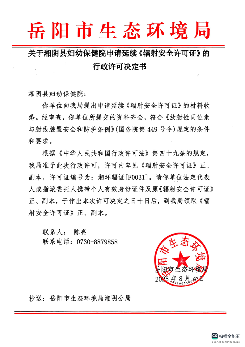 关于湘阴县妇幼保健院申请延续《辐射安全许可证》的行政许可决定