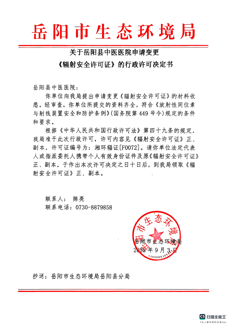 关于岳阳县中医医院申请变更《辐射安全许可证》的行政许可决定