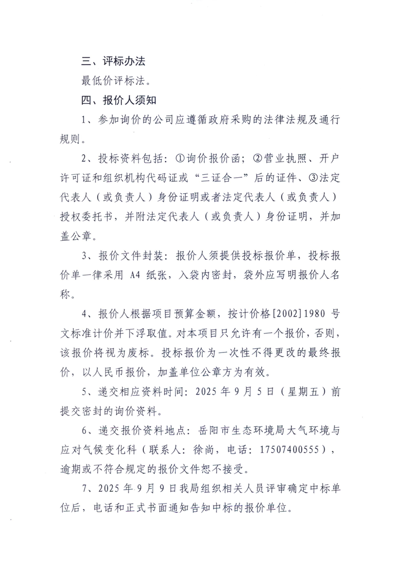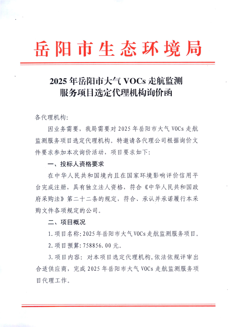 2025年岳阳市大气VOCs走航监测服务项目选定代理机构询价函