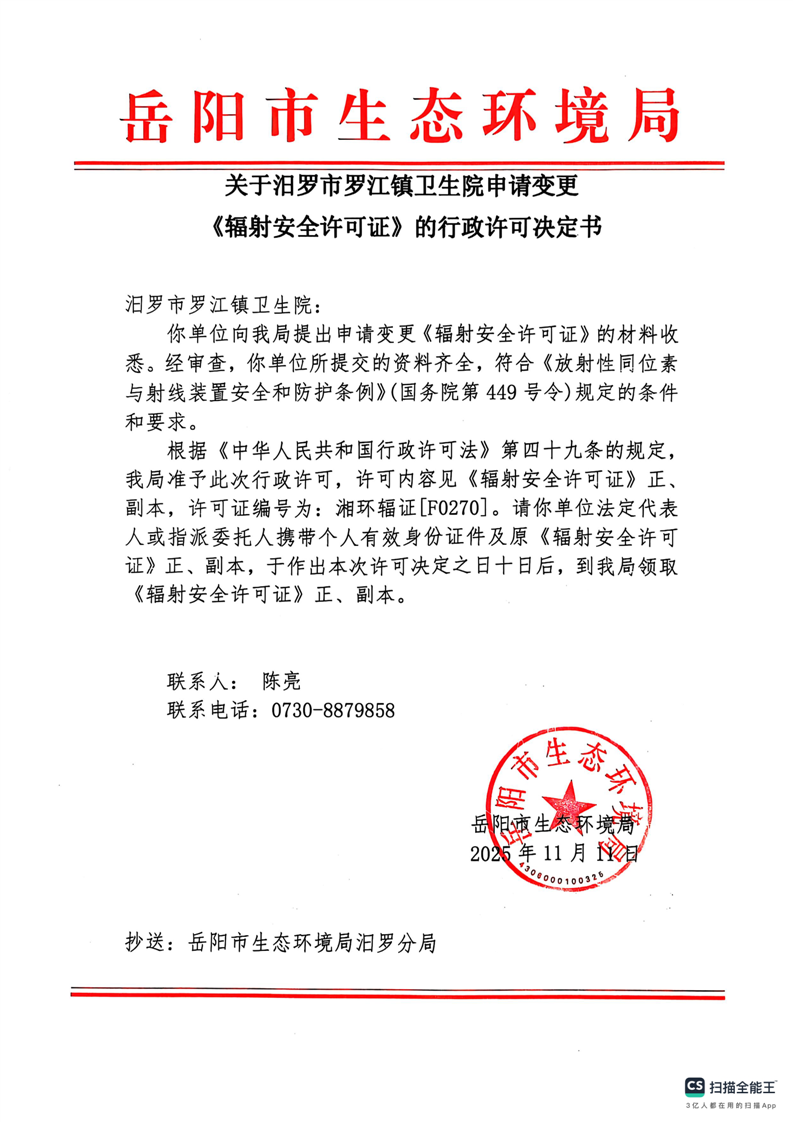 汨罗市罗江镇卫生院申请变更《辐射安全许可证》的行政许可决定