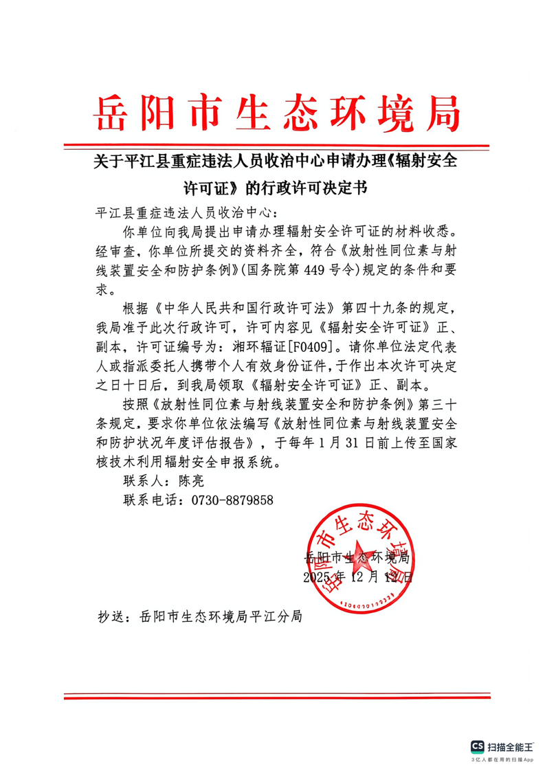 平江县重症违法人员收治中心申请办理《辐射安全许可证》的行政许可决定