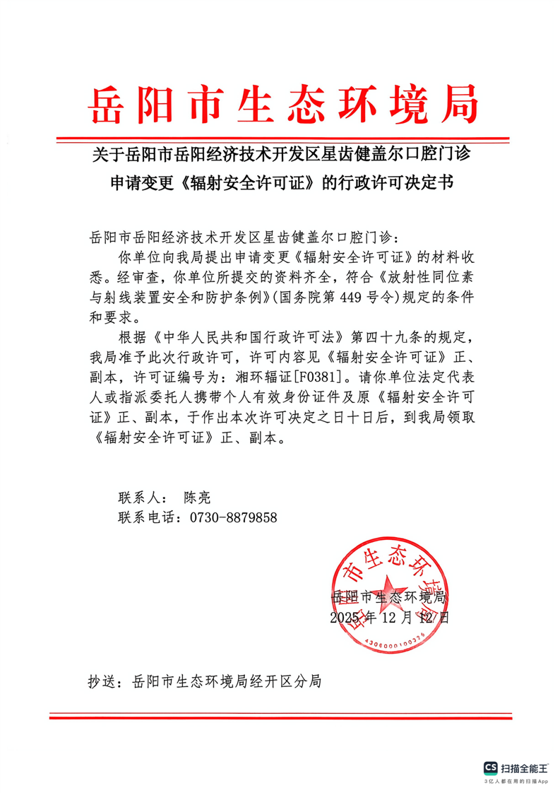 关于岳阳市岳阳经济技术开发区星齿健盖尔口腔门诊有限公司申请变更《辐射安全许可证》的行政许可决定