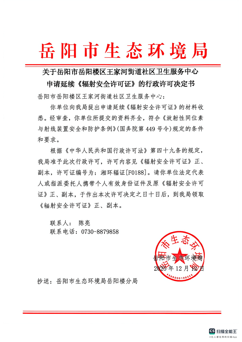 关于岳阳市岳阳楼区王家河街道社区卫生服务中心申请延续《辐射安全许可证》的行政许可决定