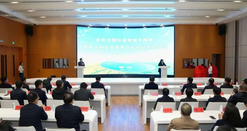 11月25日,岳阳市国际湿地城市揭牌暨政学研生态保护合作协议签约仪式在洞庭湖博物馆举行。省委副书记、岳阳市委书记谢卫江,中国工程院院士、中南林业科技大学党委书记吴义强为岳阳市国际湿地城市揭牌并见证签约。市委副书记、市长李挚主持,中南林业科技大学党委副书记、校长仇怡,省林业局党组成员、副局长李林山致辞并见证签约。